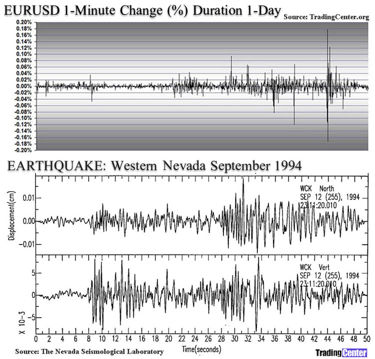 The following chart shows the 1-minute percentage changes of EUR/USD during a random trading day, and a random earthquake that occurred in Western Nevada in the last days of September 1994.